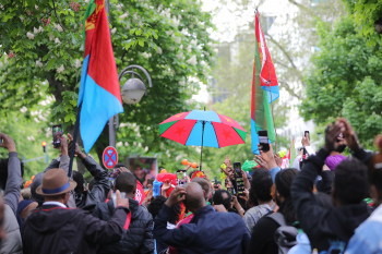 01.05.2022 xkhx Frankfurt am Main Radklassiker (Radrennen) Eschborn-Frankfurt Bergwertung Feldbarg Die eritreischen Landsleute feierten ihren ersten Profi-Rennfahrer Biniam Girmay frenetisch und belagerten seinen Wohnwagen *** Foto Peter Hartenfelser