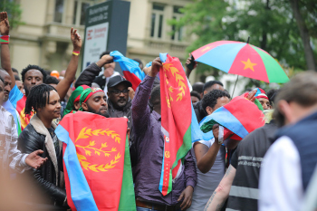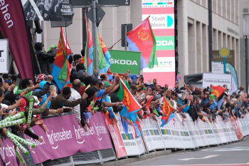01.05.2022 xkhx Frankfurt am Main Radklassiker (Radrennen) Eschborn-Frankfurt Bergwertung Feldbarg Die eritreischen Landsleute feierten ihren ersten Profi-Rennfahrer Biniam Girmay frenetisch *** Foto Peter Hartenfelser