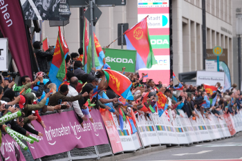 01.05.2022 xkhx Frankfurt am Main Radklassiker (Radrennen) Eschborn-Frankfurt Bergwertung Feldbarg Die eritreischen Landsleute feierten ihren ersten Profi-Rennfahrer Biniam Girmay frenetisch - es gab kein durchkommen *** Foto Peter Hartenfelser