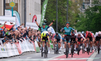 01.05.2022 xkhx Frankfurt am Main Radklassiker (Radrennen) Eschborn-Frankfurt Bergwertung Feldbarg Sieger Sam Benett (IRL) im Ziel jubelnd *** Foto Peter Hartenfelser