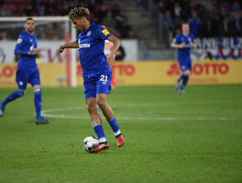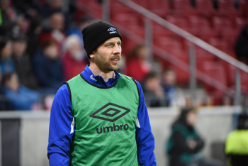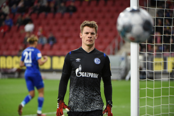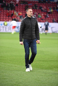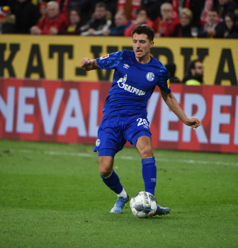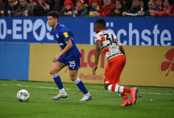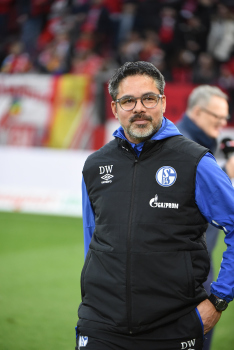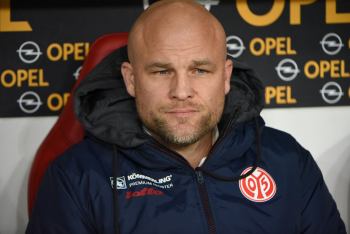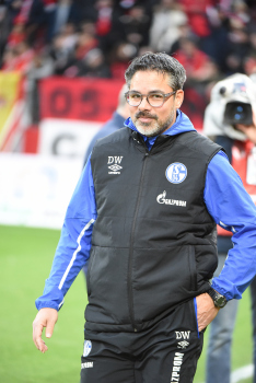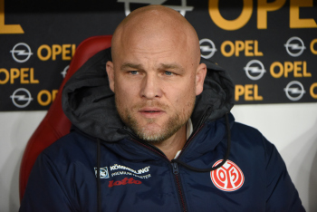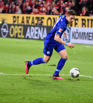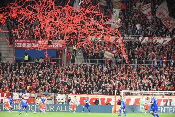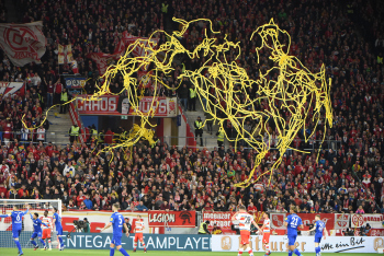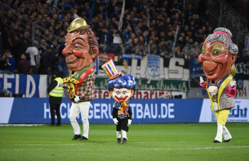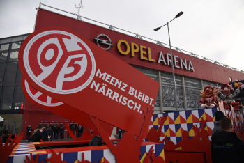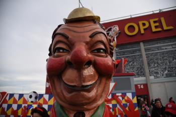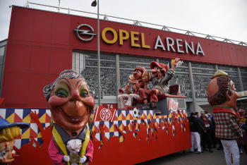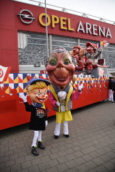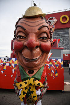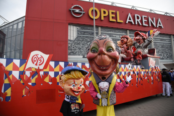 vor der Opel-Arena der Mainzer Karnvalswagen mit den Mainzer Schwellköpfen