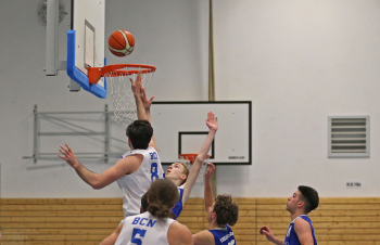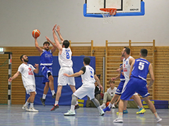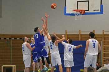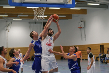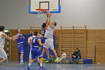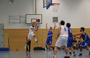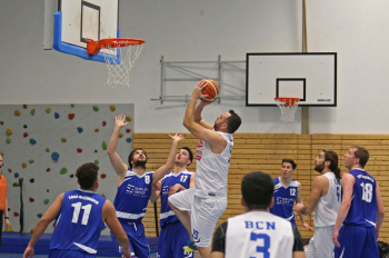 xxx 13.01.2018, Basketball Landesliga Sued 2017/2018, EOSC Offenbach - BC Neu-Isenburg; v.l. Korb durch V. Ourgantzidis Kapitaen (EOSC Basketball), I. Thoniatis (BC Neu Isenburg), D. Hack (BC Neu Isenburg), E. Babaoglu (BC Neu Isenburg), Louis Feistkorn (BC Neu Isenburg)