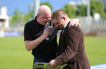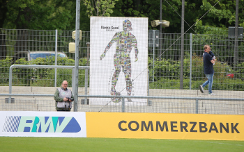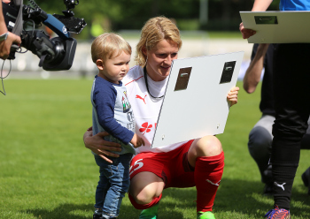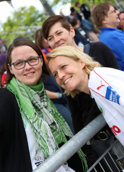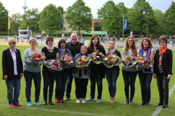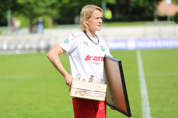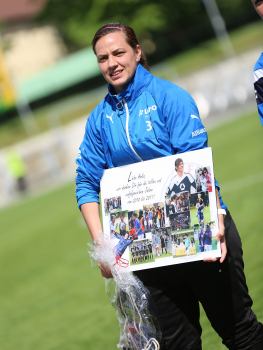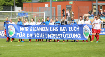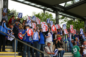 Fans mit Fotos der Spielerinnen, die den Verein verlassen werden, Fanblock, Verabschiedung
