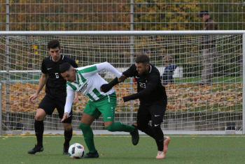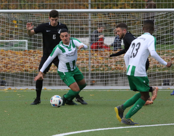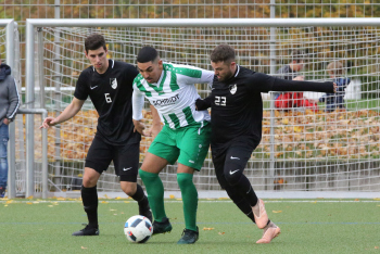 20.10.2019, xmgoodx Neu-Isenburg, Buchenbusch KOL Offenbach Saison 2019/2020 TSG Neu-Isenburg - TSG Mainflingen Bilal El Assraoui (Mainflingen) gegen Ayberk Karasu und Marcel Lipka (TSG) ****** Foto: Peter Hartenfelser