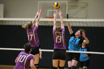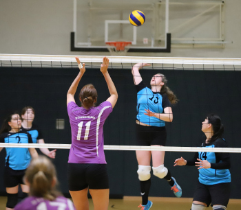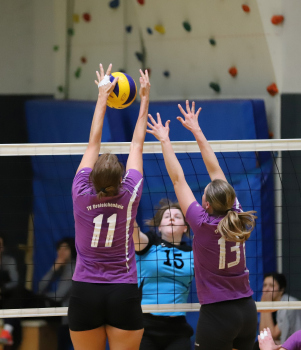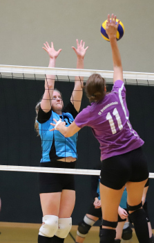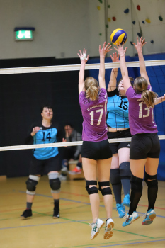 17.03.2019Dreieich Volleyball: Frauen TV Dreieichenhain - VSG Dieburg/Münster Hertborn (14) (VSG Dieburg/Münster) gegen Schäfer (13) und Lara Walter, (17) (TV Dreieichenhain) ****** Foto: Peter Hartenfelser