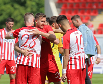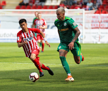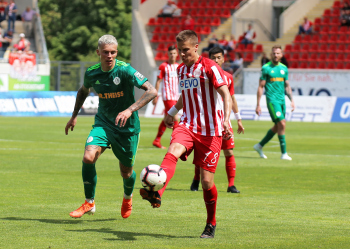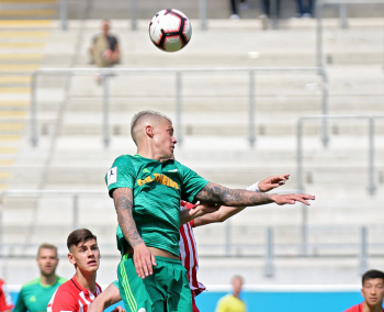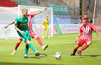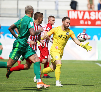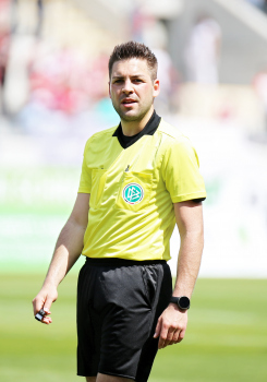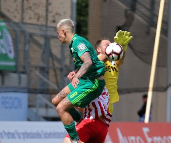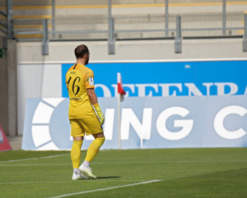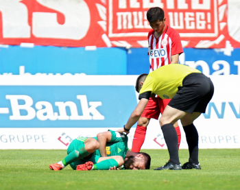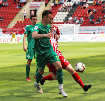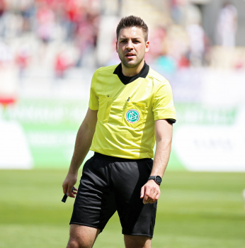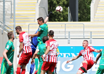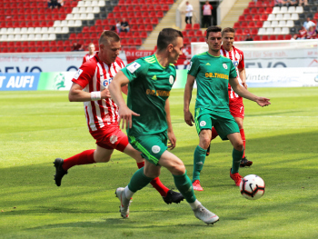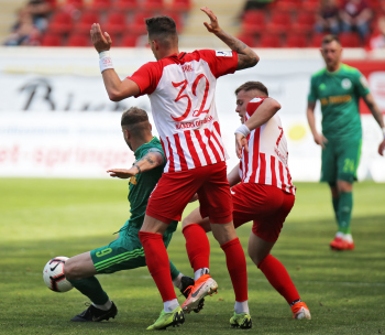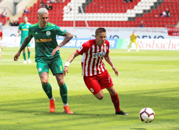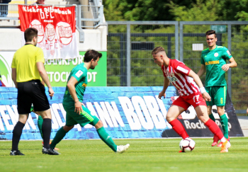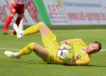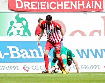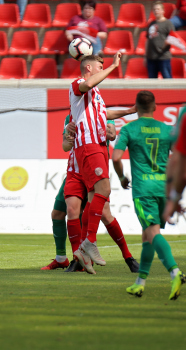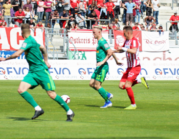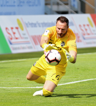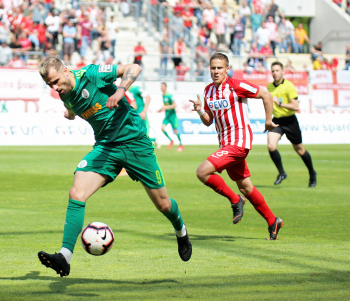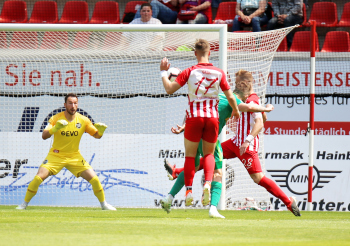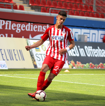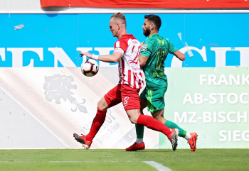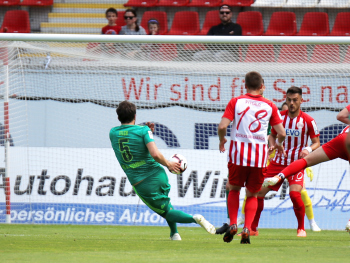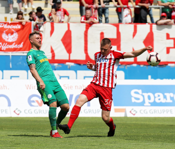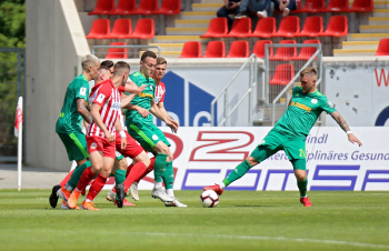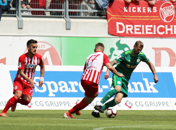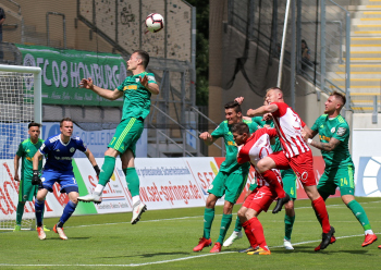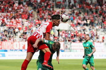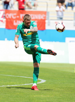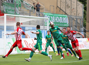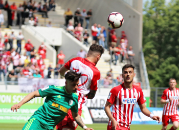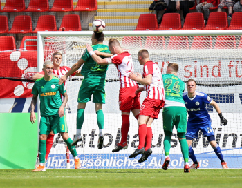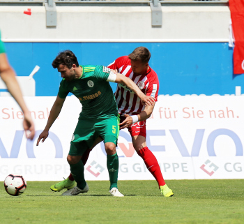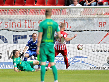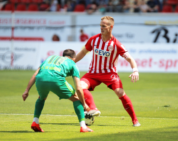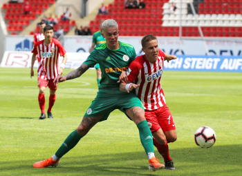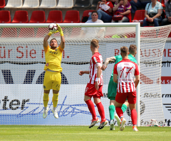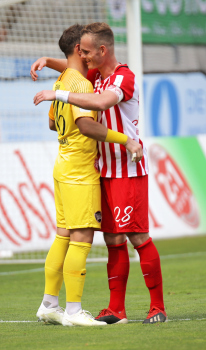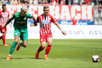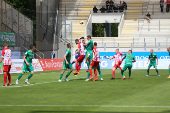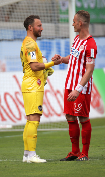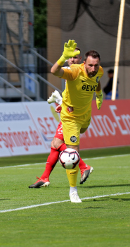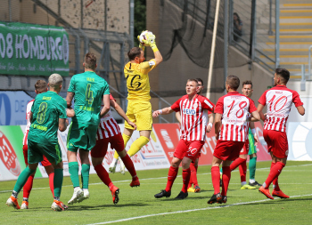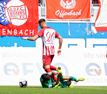18.05.2019, xxx, Fussball, Offenbach am Main, Sparda- Bank-Hessen Stadion, Regionalliga Suedwest, Saison 2018/2019, Kickers Offenbach (OFC) gegen FC 08 Homburg; Mark-Patrick Redl Torwart (FC 08 Homburg), klaert vor Benjamin Kirchhoff Kapitaen (Kickers Offenbach), in gruen Tim Stegerer (FC 08 Homburg),