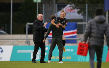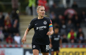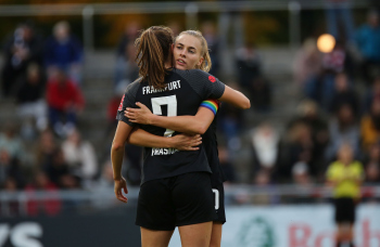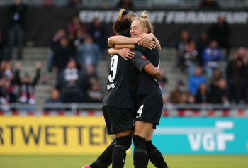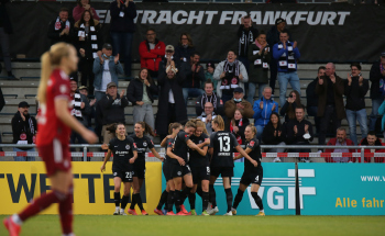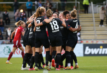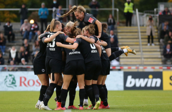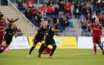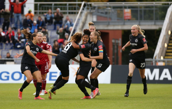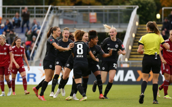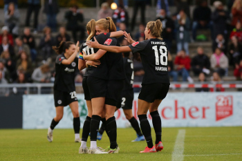 FLYERALARM Frauen-Bundesliga Saison 2021/2022, Spieltag 6, SGE, FCB, Eintracht Frankfurt Frauen - FC Bayern Muenchen Frauen, Torjubel Eintracht Frankfurt Frauen, Jubel, Freude, Emotionen, Goal celebration, Shekiera Martinez, Lara Prasnikar, Sjoeke Nuesken, Laura Freigang, Camilla Kuever (SGE)