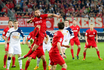 10.04.2015; xomx; Fussball; Deutschland; Regionalliga Südwest; Kickers Offenbach vs. TuS Koblenz; 4 Fussball Liga OFC Spieler Giuliano Modica springt im Kopfballduell am höchsten. ****** Foto: Hartenfelser