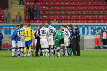 10.04.2015; xomx; Fussball; Deutschland; Regionalliga Südwest; Kickers Offenbach vs. TuS Koblenz; 4 Fussball Liga Spielerkreis der TuS Koblenz nach der iederlage in Offenbach. Hier unter anderem von Links Jeremy Heyer, Fabrice Vollborn, Andre Marx, Admir Softic, Danko Boskovic. ****** Foto: Hartenfelser