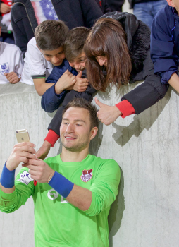 10.04.2015; xomx; Fussball; Deutschland; Regionalliga Südwest; Kickers Offenbach vs. TuS Koblenz; 4 Fussball Liga OFC Torwart Daniel Endres macht ein Selfie mit seinen Fans ****** Foto: Hartenfelser