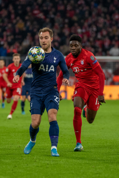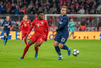 Alphonso Davies (FC Bayern Muenchen) und Christian Dannem Eriksen (Tottenham Hotspurs). Deutschland, Muenchen, 11.12.2019, FuBa, UEFA Champions League, Matchday 6: FC Bayern Muenchen vs Tottenham Hotspur, Allianz-Arena *** Quelle: Hartenfelser, hoehere Aufloesung auf Anfrage, Verwendung honorarpflichtig, Belegexemplar erbeten IBAN: DE04 5055 0020 0112 0515 70 SWIFT/BIC HELADEF10FF UST-Nummer 3582501720 MWST-Satz 7%.