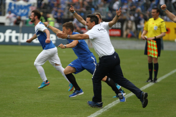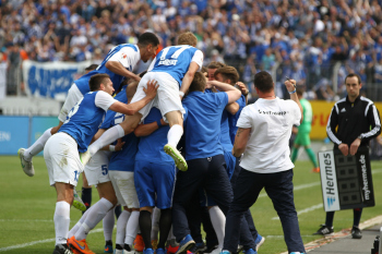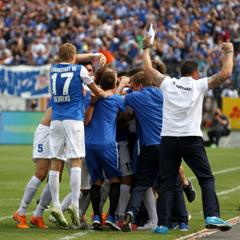 Torwart Robin Himmelmann (Pauli) geschlagen, Torjubel durch Hanno Behrens und Leon Balogun (SV 98)