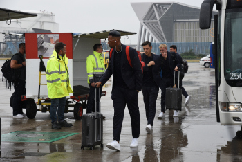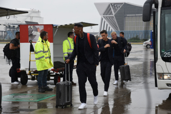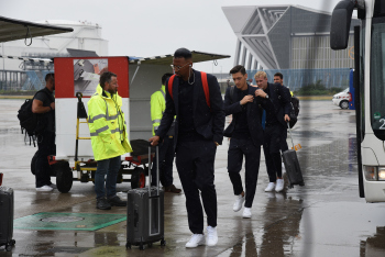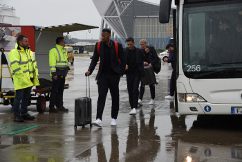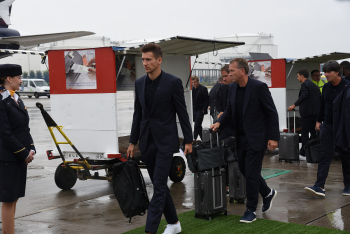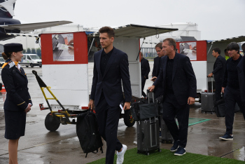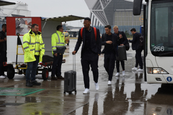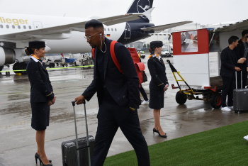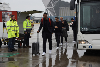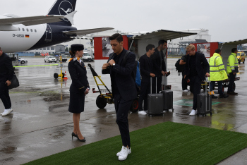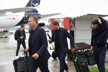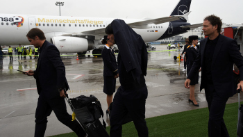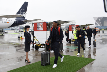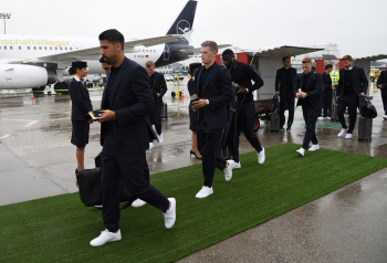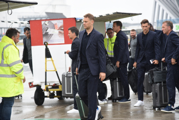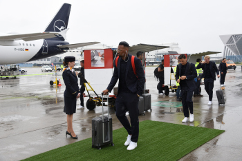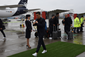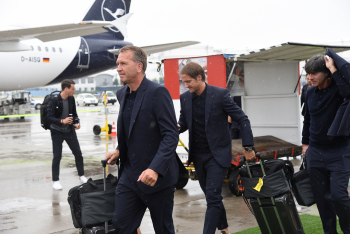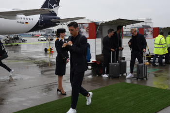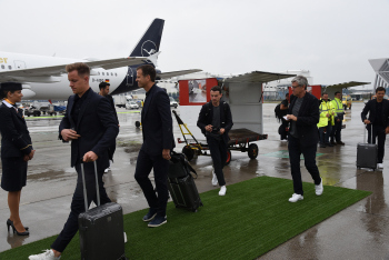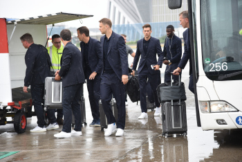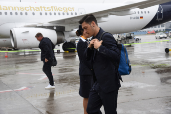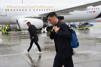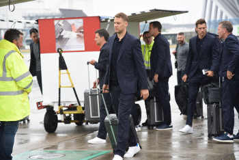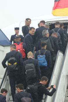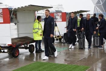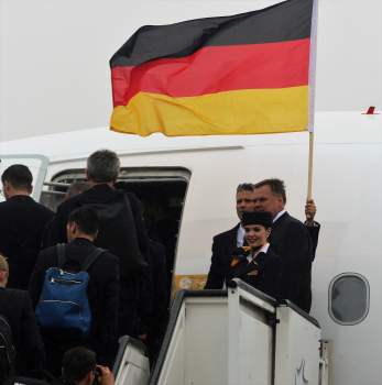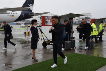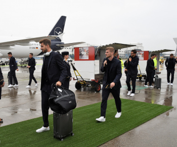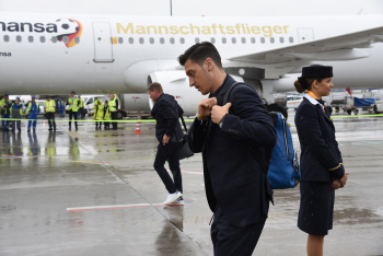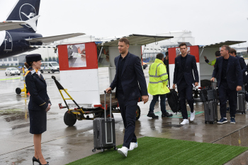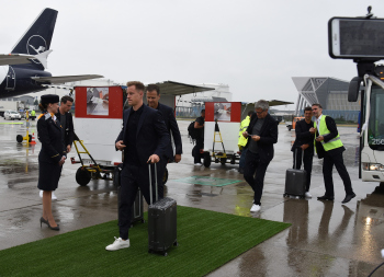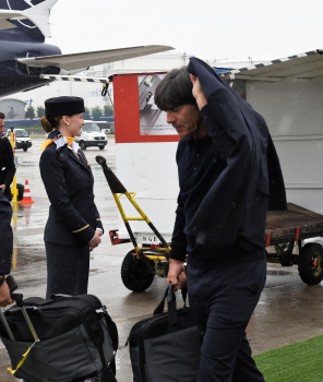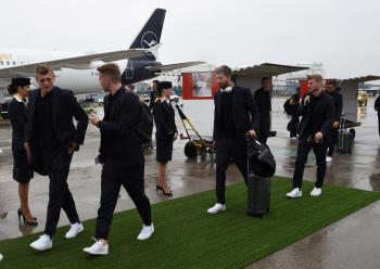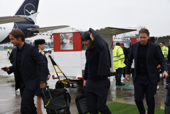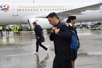 Abflug der Deutschen Nationalmannschaft mit dem Flug LH 2018 von Frankfurt am Main nach Moskau zur Weltmeisterschaft 2018
