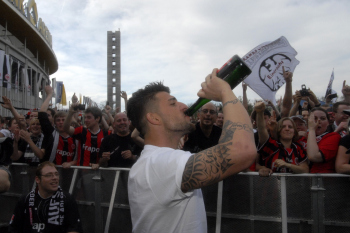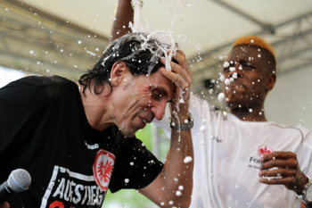 Sportdirektor Bruno H?bner (Eintracht Frankfurt) nass aber gl?cklich nach der Sektdusche