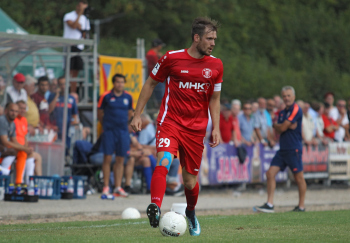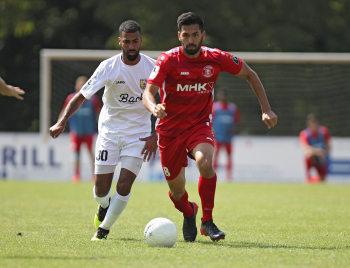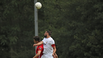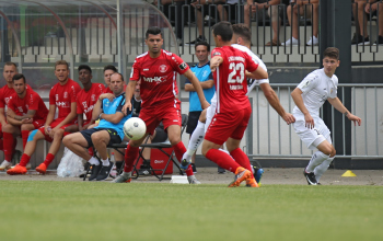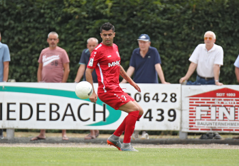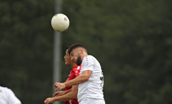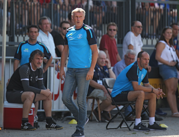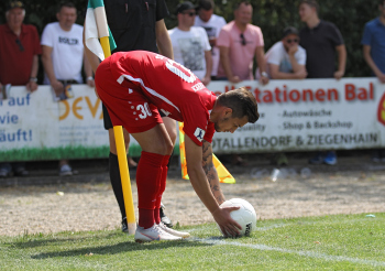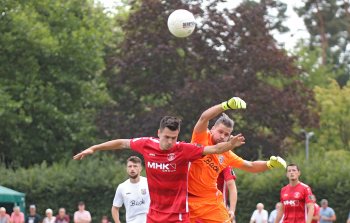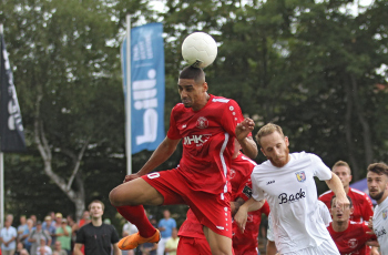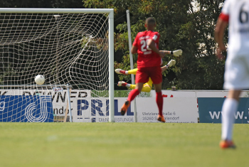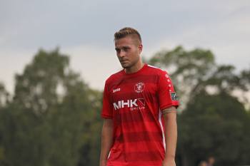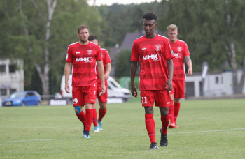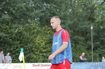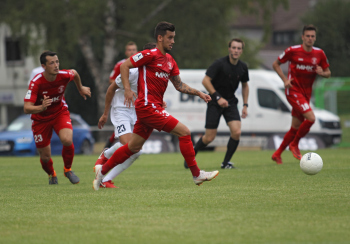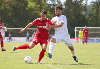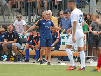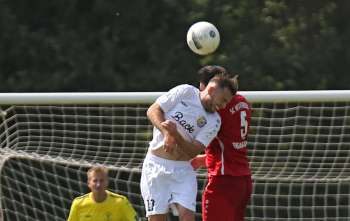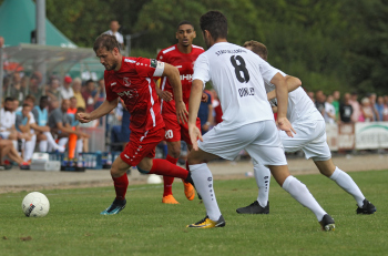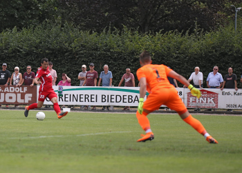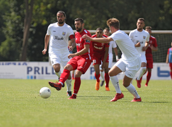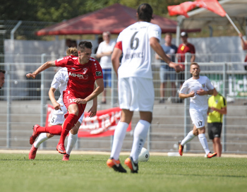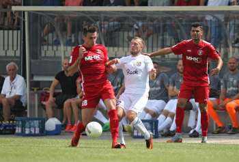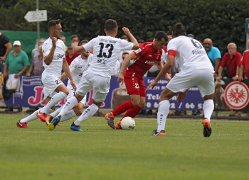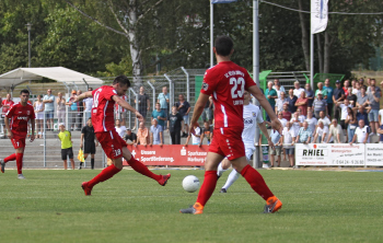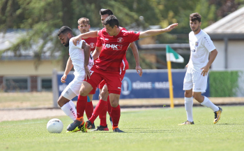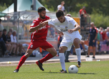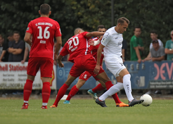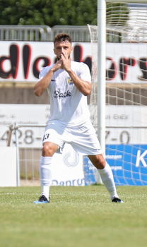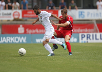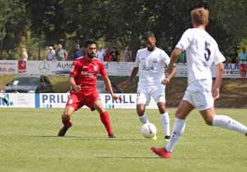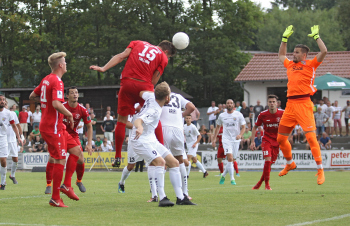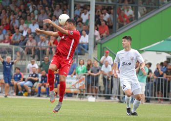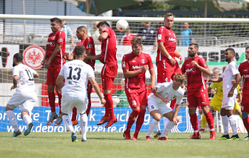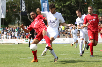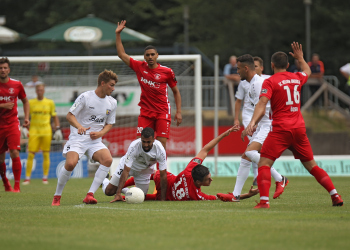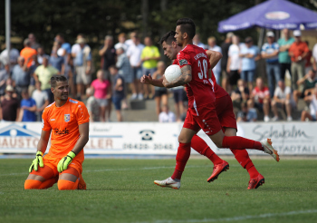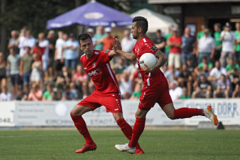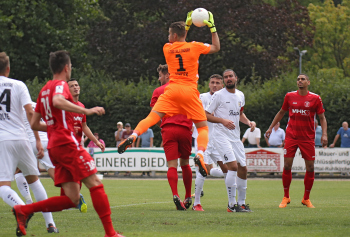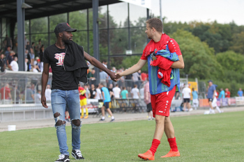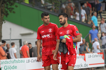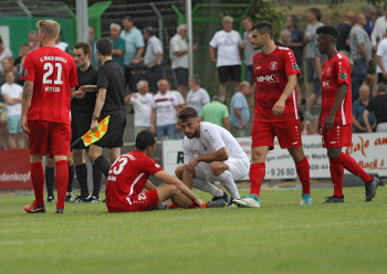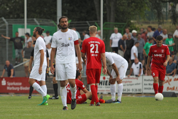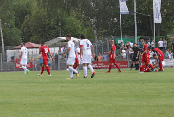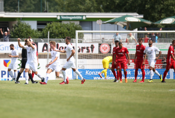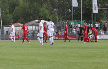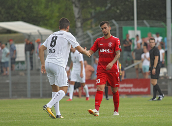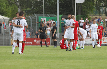 28.07.2018, xxx, Stadtallendorf, Herrenwaldstadion, Regionalliga Suedwest, Saison 2018/2019, Eintracht Stadtallendorf gegen SC Hessen Dreieich vl.: Spieler von beiden Vereinen nach dem Spiel Daniel Vier (Eintracht Stadtallendorf), Andre Fliess (SC Hessen Dreieich), Ceyhun Dinler (Eintracht Stadtallendorf), Kevin Vidakovics Kapitaen (Eintracht Stadtallendorf), Yves Boettler (SC Hessen Dreieich), Alexandros Theodosiadis (SC Hessen Dreieich),
