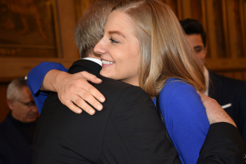 10.02.2020 Frankfurt am Main, Römer Eintracht-Frankfurt Legende Karl-Heinz Charly Körbel erhält Ehrenplakette der Stadt Frankfurt Bild zeigt Karl-Heinz Charly Körbel mit Tochter Carla *** Foto Peter Hartenfelser ********* Foto: Peter Hartenfelser