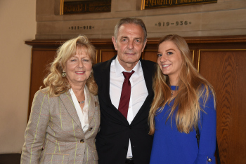 10.02.2020 Frankfurt am Main, Römer Eintracht-Frankfurt Legende Karl-Heinz Charly Körbel erhält Ehrenplakette der Stadt Frankfurt Bild zeigt Karl-Heinz Charly Körbel mit seiner Ehefrau Margit und Tochter Carla *** Foto Peter Hartenfelser ********* Foto: Peter Hartenfelser