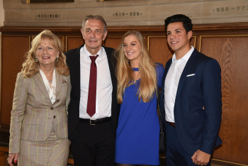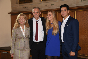 10.02.2020 Frankfurt am Main, Römer Eintracht-Frankfurt Legende Karl-Heinz Charly Körbel erhält Ehrenplakette der Stadt Frankfurt Bild zeigt Karl-Heinz Charly Körbel mit seiner Ehefrau Margit ud Tochter Carla mit Freund Miquel *** Foto Peter Hartenfelser ********* Foto: Peter Hartenfelser