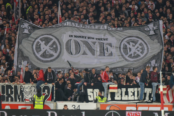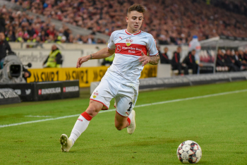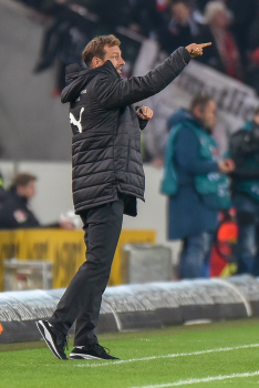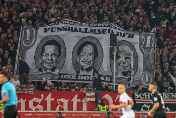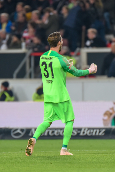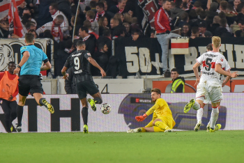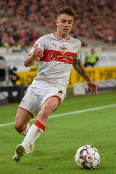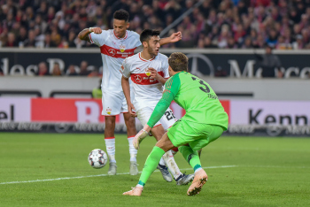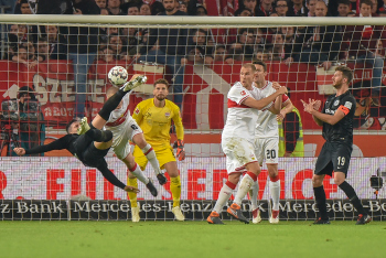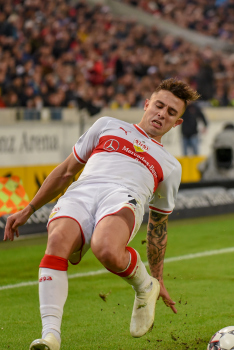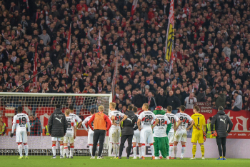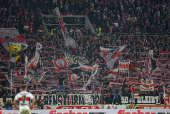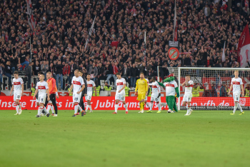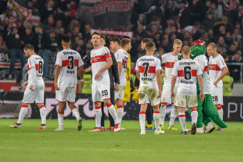 Die Stuttgarter Benjamin Pavard, Santiago Ascacibar, Andreas Beck, Holger Badstuber, Dennis Aogo, Mario Gomez, Torwart Ron-Robert Zieler, Chadrac Akolo, Maskottchen Fritzle, Pablo Maffeo Becerra und Timo Baumgartl verlassen enttäuscht und mit hängenden Köpfen den Platz.
