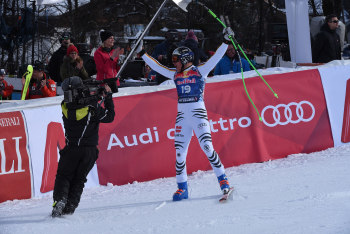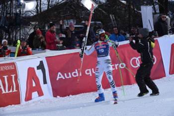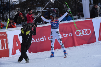 dahinter Expertin Maria Höfl-Riesch applaudiert