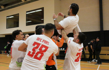 05.02.2023Offenbach am Main, FUTSAL-Regionalliga Süd - Saison 2022/2023 FUTSAL OFC/Pars - SGM TSV Weilimdorf II/SV Stuttgarter Kickers 2 Ziel Aufstieg in die Futsal-Bundesliga Meistertrainer - die Spieler lassen Sasan Tabib hochleben ***** Foto: A2Bildagentur Hartenfelser