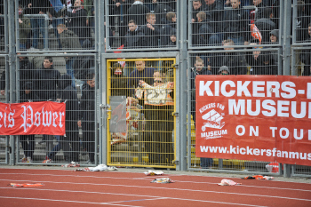 Die OFC-Fans provozieren Kassel-Fans ?Ist die Fresse noch so gro?, eure Fahnen seid ihr los?.