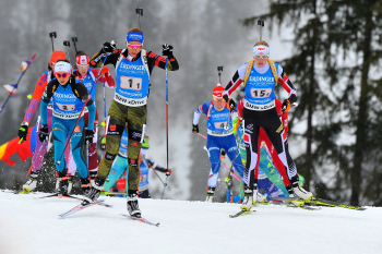 Der Startschuss ist erfolgt, v.l. Vanessa HINZ (GER), Marketa DAVIDOVA (CZE), Kinga MITORAJ (POL), Anais CHEVALIER (FRA), Kaia NICOLAISEN (NOR).