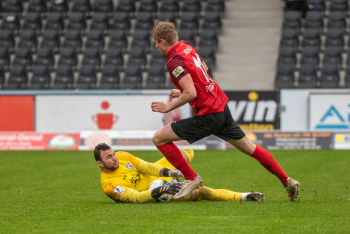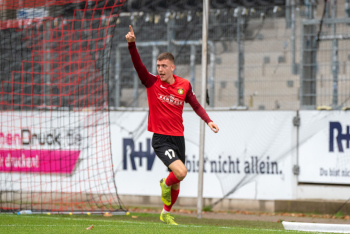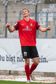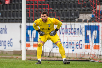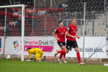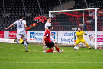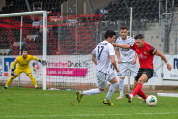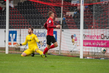 Jonas Meiser (SG Sonnenhof-Grossaspach) erzielt das 1:0, Torwart Aykut Bayar (TSV Eintracht Stadtallendorf) enttäuscht, Enttäuschung, Frust, frustriert, niedergeschlagen.