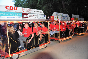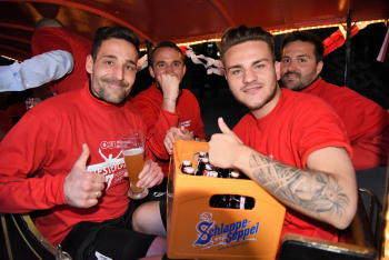 08.06.2017 Neu-Isenburg, Sportpark Spvgg. 03 Neu-Isenburg feiert den Aufstieg in die Hessenliga Marco Betz (5, Spvgg 03 Neu-Isenburg) und Henrik Nedwied (4, Spvgg 03 Neu-Isenburg) feiern in der Dino-Eisenbahn *** Foto: Hartenfelser