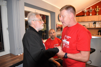 08.06.2017 Neu-Isenburg, Sportpark Spvgg. 03 Neu-Isenburg feiert den Aufstieg in die Hessenliga Trainer Peter Hoffmann (Spvgg 03 Neu-Isenburg) bedankt sich beim Pr?sidenten G?nter Marx *** Foto: Hartenfelser