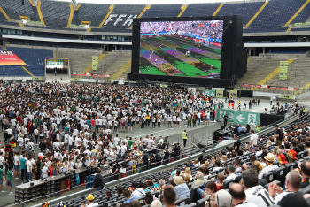 7.06.2018 Frankfurt am Main, Commerzbankarena Public viewing WM 2018, Fans Deutschland gegen Mexiko Riesenleinwand *** Foto: Peter Hartenelser