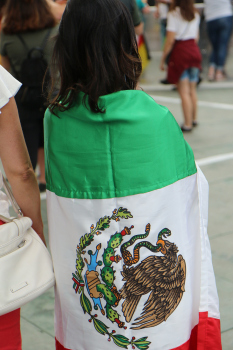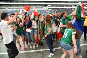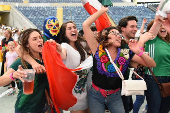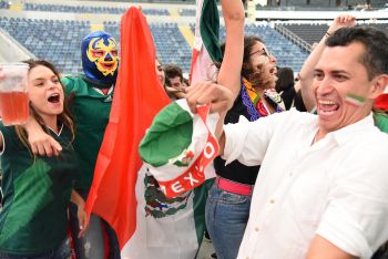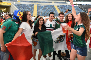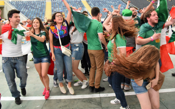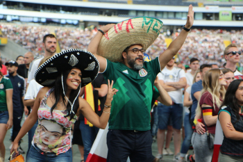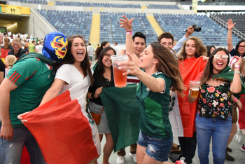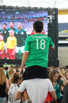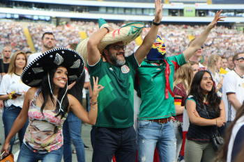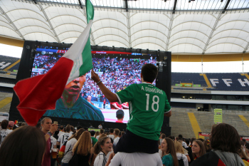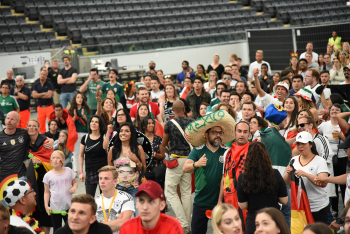 7.06.2018 Frankfurt am Main, Commerzbankarena Public viewing WM 2018 Deutschland gegen Mexiko Fans Fahnen Tröten Mexikanische Fans machen Stimmung *** Foto: Peter Hartenelser