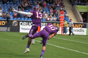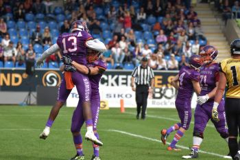 03.09.2017 xfhx Frankfurt am Main, GFL, Amercan Football Samsung Frankfurt Universe gegen Munich Cowboys Jubel QB #13 Jaleel Awini und WR #10 David Giron Jansa (Univers) **** Foto: Peter Hartenfelser