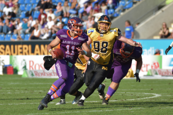 03.09.2017 xfhx Frankfurt am Main, GFL, Amercan Football Samsung Frankfurt Universe gegen Munich Cowboys QB #11 Sonny Weishaupt (Universe) gegen DL Michael Wagner (Munich Cowboys) **** Foto: Peter Hartenfelser