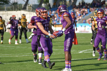 03.09.2017 xfhx Frankfurt am Main, GFL, Amercan Football Samsung Frankfurt Universe gegen Munich Cowboys RB #7 Silas Nacita und QB #13 Jaleel Awini (Universe) gegen RB Oliver Ohse (Munich Cowboys) **** Foto: Peter Hartenfelser