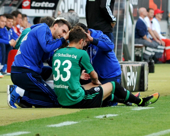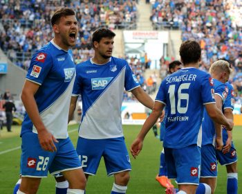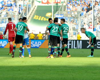 Enttaeuschte Schalker Julian DRAXLER (FC Schalke 04), Tranquillo BARNETTA (FC Schalke 04), Klaas-Jan HUNTELAAR (FC Schalke 04), Max MEYER (FC Schalke 04) gratulieren Kevin VOLLAND (TSG 1899 Hoffenheim),.