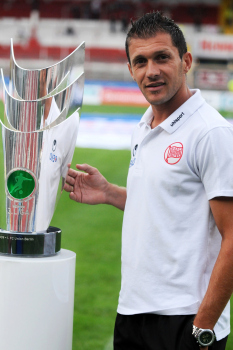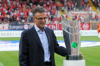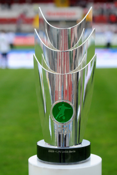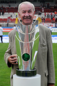 Offenbacher Kickers - 1. FC Saarbr?cken, Helmut Sandrock Deutscher Fu?ball-Bund (DFB) Direktor Team-Management, Jugend, Talentf?rderung und Trainerwesen. ..pr?sentiert den Meisterpokal der 3. Liga.