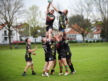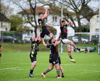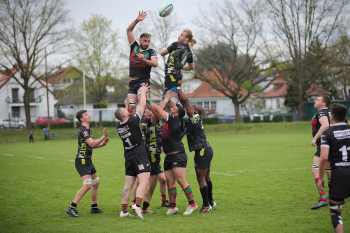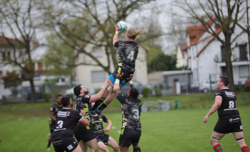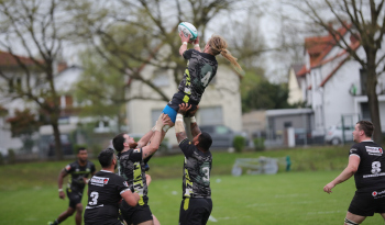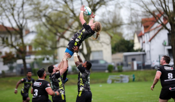 22.04.2023 Offenbach am Main Rugby Bundesliga Süd/West Offenbacher SCR (OSC Rosenhöhe) – RK Heusenstamm Wessel van Dijk (Offenbacher SCR) fängt den Ball A. Piano (RK Heusenstamm) geht leer aus ***** Foto: A2Bildagentur Hartenfelser