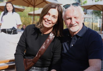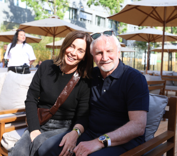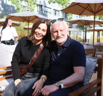 12.05.2025 Frankfurt am Main Frankfurter Gibson Beach Club - Strandfeeling mitten im Bankenviertel Mit dabei ganz entspannt DFB-Sportdirektor Rudi Völler mit seiner Ehrefrau Sabrina ********* Foto: Peter Hartenfelser