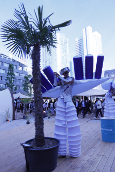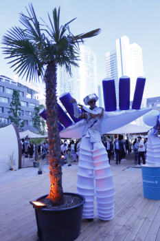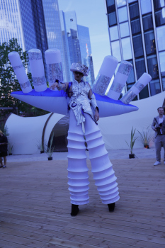 12.05.2025 Frankfurt am Main Frankfurter Gibson Beach Club - Strandfeeling mitten im Bankenviertel Stelzenläufer unterhalten die Gäste ********* Foto: Peter Hartenfelser