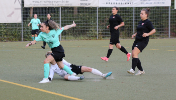 Caroline Thomas und Hannah Louise Krapp (SV Zellhausen) gegen Amelie Pollara (FC Neu-Isenburg)