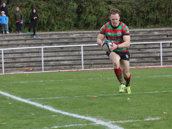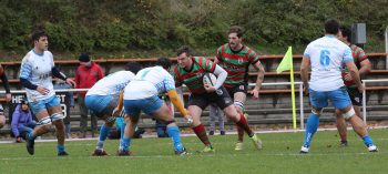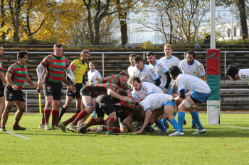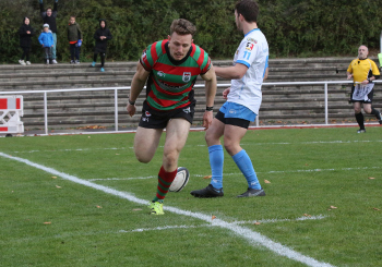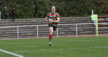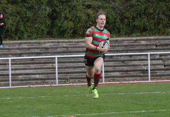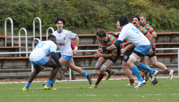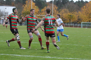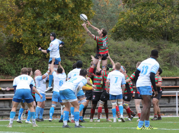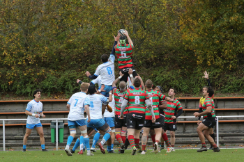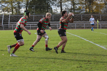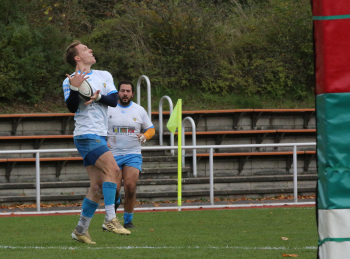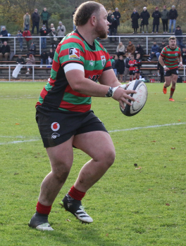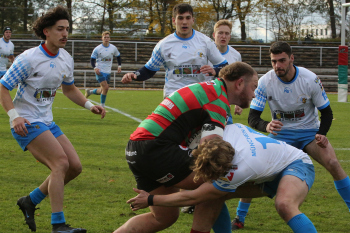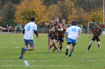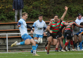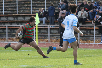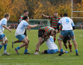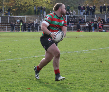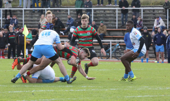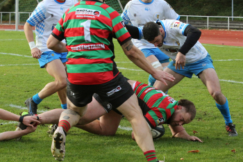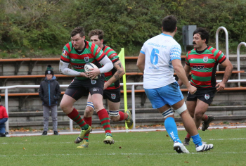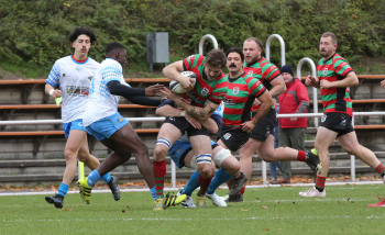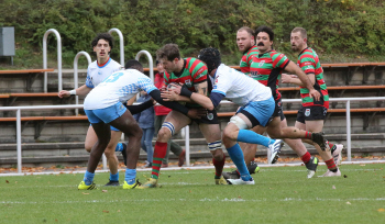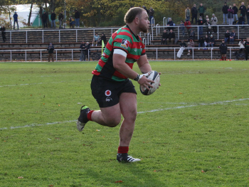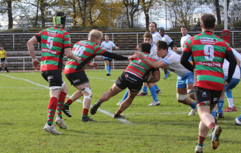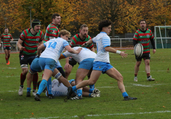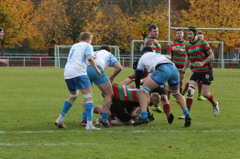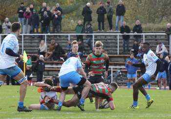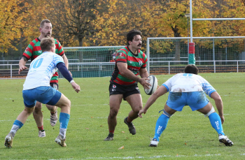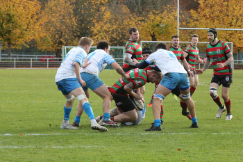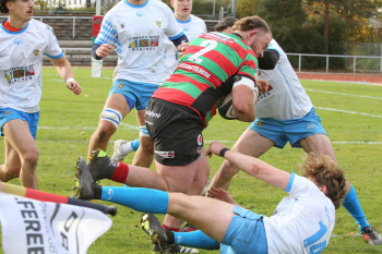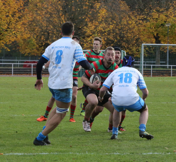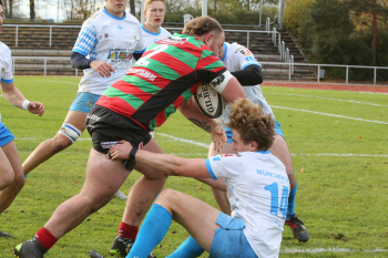 Kim Janek Moreno Perez (Heusenstamm) mit dem Ball gegen Jacob Fafiolu und Sam Kreuz (München)