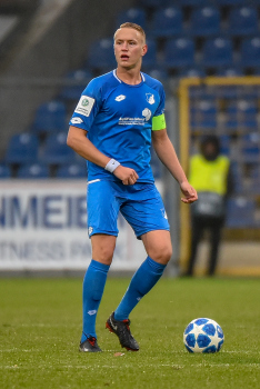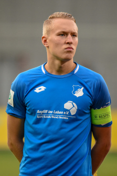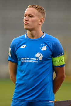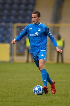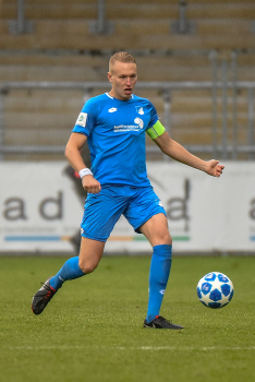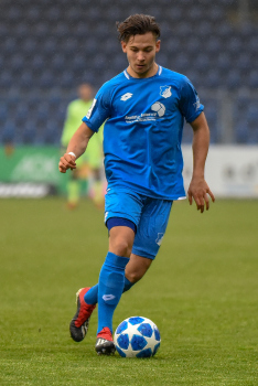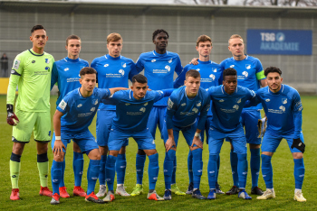 Die Startelf der TSG 1899 Hoffenheim U19, Torwart Daniel Klein (TSG 1899 Hoffenheim U19), Max Geschwill (TSG 1899 Hoffenheim U19), Amadou Onana (TSG 1899 Hoffenheim U19), Benjamin Wallquist (TSG 1899 Hoffenheim U19), Tobias Heiland (TSG 1899 Hoffenheim U19), Enes Tubluk (TSG 1899 Hoffenheim U19), Alfonso Amade (TSG 1899 Hoffenheim U19), Domenico Alberico (TSG 1899 Hoffenheim U19).