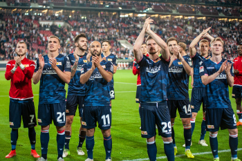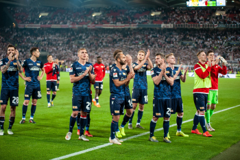 Christopher Trimmel (1.FC Union Berlin), Robert Zulj (1.FC Union Berlin), Grischa Prömel (1.FC Union Berlin), Ken Reichel (1.FC Union Berlin), Philipp Hosiner (1.FC Union Berlin), Michael Parensen (1.FC Union Berlin) feiern mit Ihren Fans.