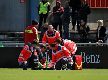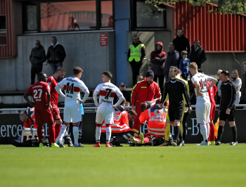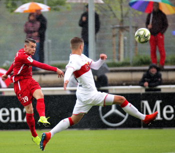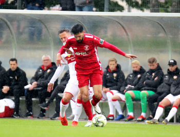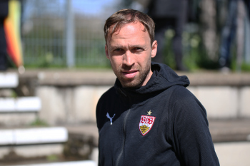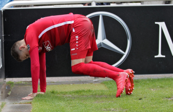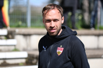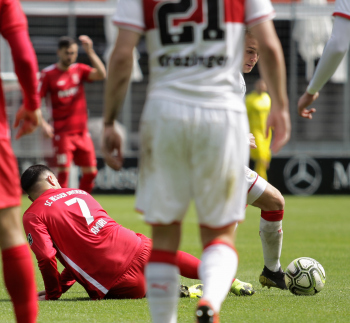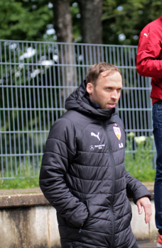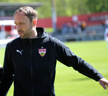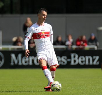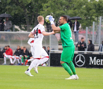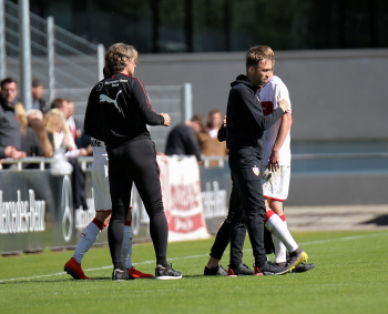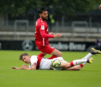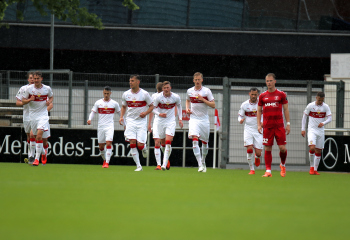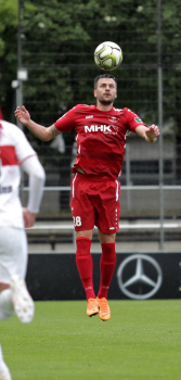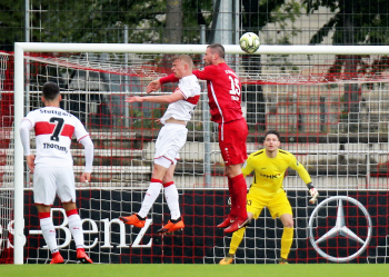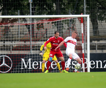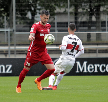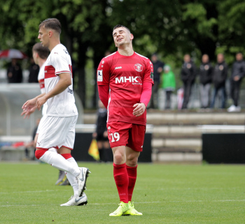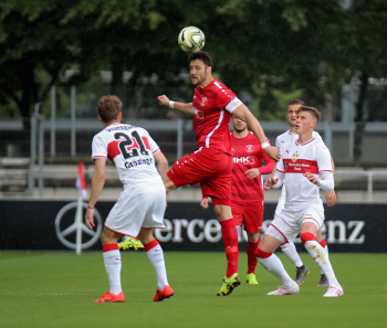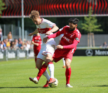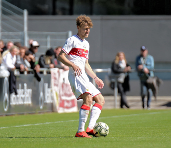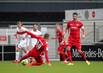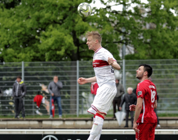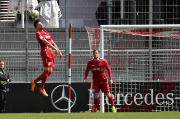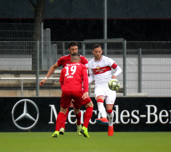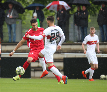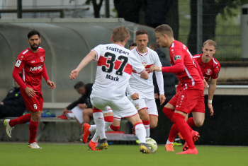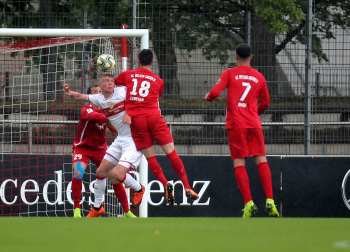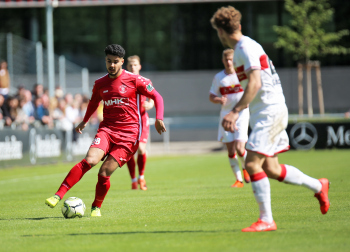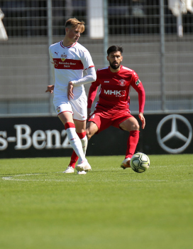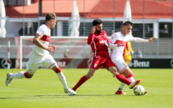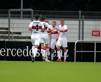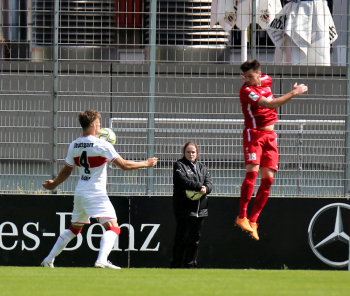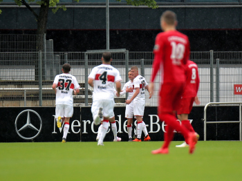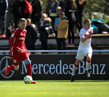 28.04.2019, xxx, Stuttgaqrt Robert Schlienz Stadion Regionalliga Suedwest, Saison 2018/2019, VfB Stuttgart II gegen SC Hessen Dreieich, Tor zum 1:0 durch David Kopacz (VfB Stuttgart II), in der 21. Minute , Jubel mit Jan Ferdinand (VfB Stuttgart II), Manuel Kober (VfB Stuttgart II), Luca Mack (VfB Stuttgart II),