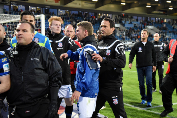 die FSV Frans sind w?tend und haben den Zaun ?berwunden. Gegenseitige Beschimpfungen Alexander Huber wird w?tend, w?hrend Denis Epstein versucht zu beruhigen
