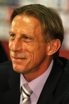 Trainer Christoph Daum (Eintracht) angespannt, im Hintergrund der Eintrachtadler