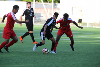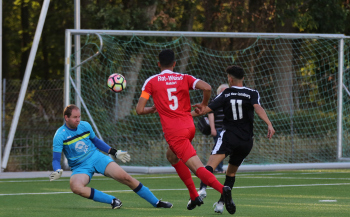Geith Hammad (SG Neu-Isenburg) gegen Torwart Florian Knacker (RW Walldorf II) und Steven Sallan (RW Walldorf II)