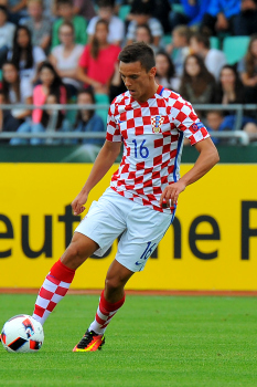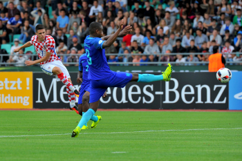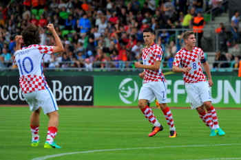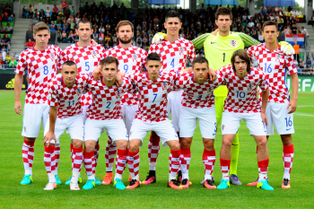 Die kroatische Startelf, h.r.v.l. k8#, Vinko Soldo (CRO),. Fran Brodic (CRO), Martin Erlic (CRO), Torwart Karlo Letica (CRO), Nikola Moro (CRO), v.r.v.l. Davor Lovren (CRO), Matej Hudecek (CRO), Josip Brekalo (CRO), Silvio Anocic (CRO), Andrija Balic (CRO).
