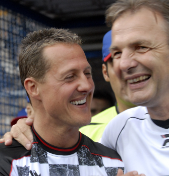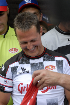 16.07.2008, Michael Schumacher freut sich ?ber das Eintracht-Trikot von Charly K?rbel